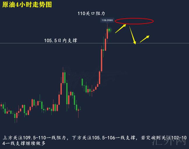 原油技术分析来分析,日K线上,星期二原油依托MA5日移动均线展开上升,报得实体大阳,日K线上,今日行情开盘持续上升,当前涨至高峰109.3美元一线,日K线上,推荐耐心等候回调买涨,切勿高点追多;4小时上,星期二原油呈震荡上涨行情持续上升,并没有断刺破上缘,目前布林带处在开口期,MA均线三线往上,呈买方排列,KDJ随机指标三线向前,到达超买,MACD指标红色量能柱连续放量,快慢线金叉往上,综合来说,原油当前或短时间到顶,推荐先空后多,上方注意109.5-110一线压力,以下注意105.5-106短时间支撑,其次102-104支撑。