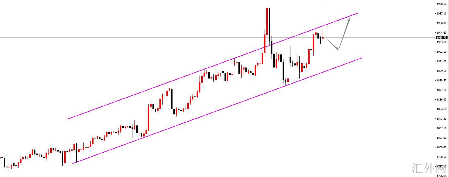 昨天在击穿了震荡区间上沿1920后面,一路增速到1850一线,收线一根饱满的大阳线,宣布了买方的回到,今天亚盘只一个小的调动后就持续上拉,截至发稿,黄金价格又回归了1950左右。