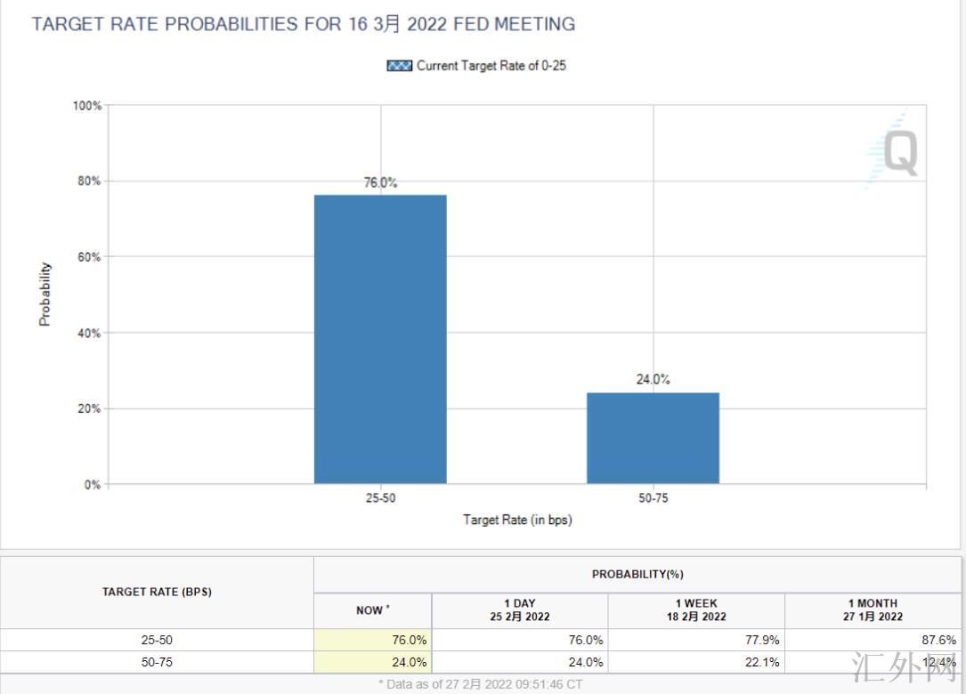 然而,从芝加哥商品交易所期货报告表明,当前策略员预计3月加息的几率为100%,但加息50个基点的概率已经从上星期三的约30%巨降到24% ,加息25个基点的几率则升到76%.