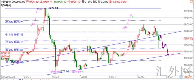 当下黄金又是重新回归了区间整顿内,可以从小时图目睹,当前顶部在1933左右,这里是当前黄金的区域高点抑制点。