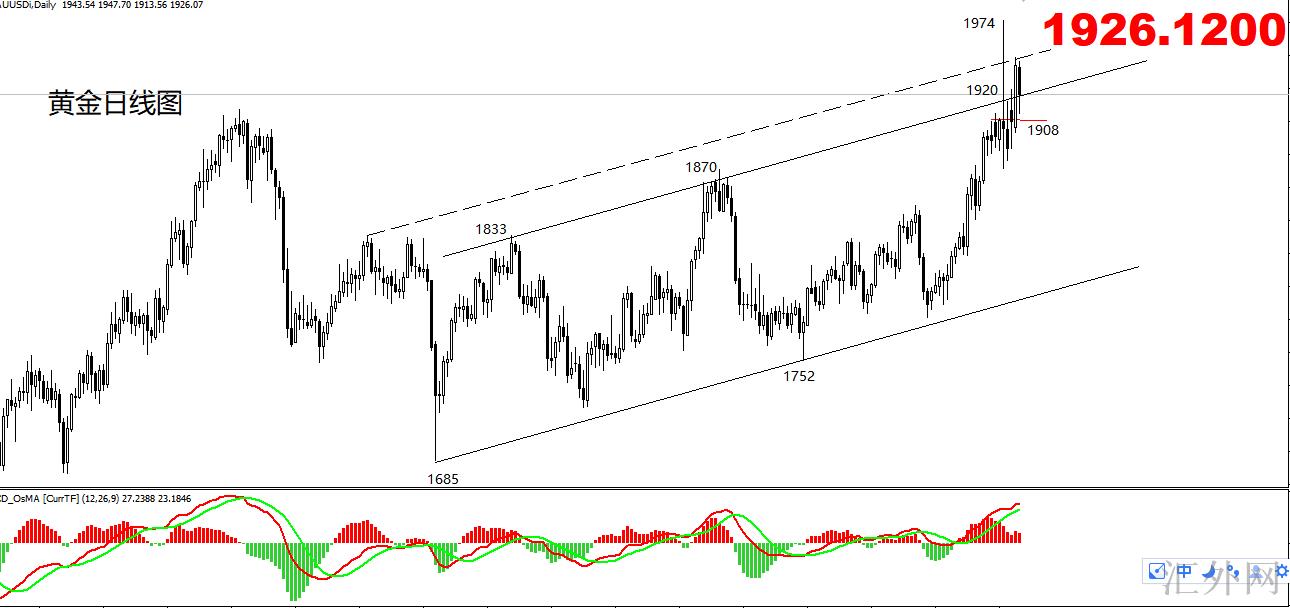 日K线上升趋势末端,还没有到顶的痕迹,中线空单则需求注意破高峰1973后再找机会,亦或者突破1908形成顶部后再找机会。