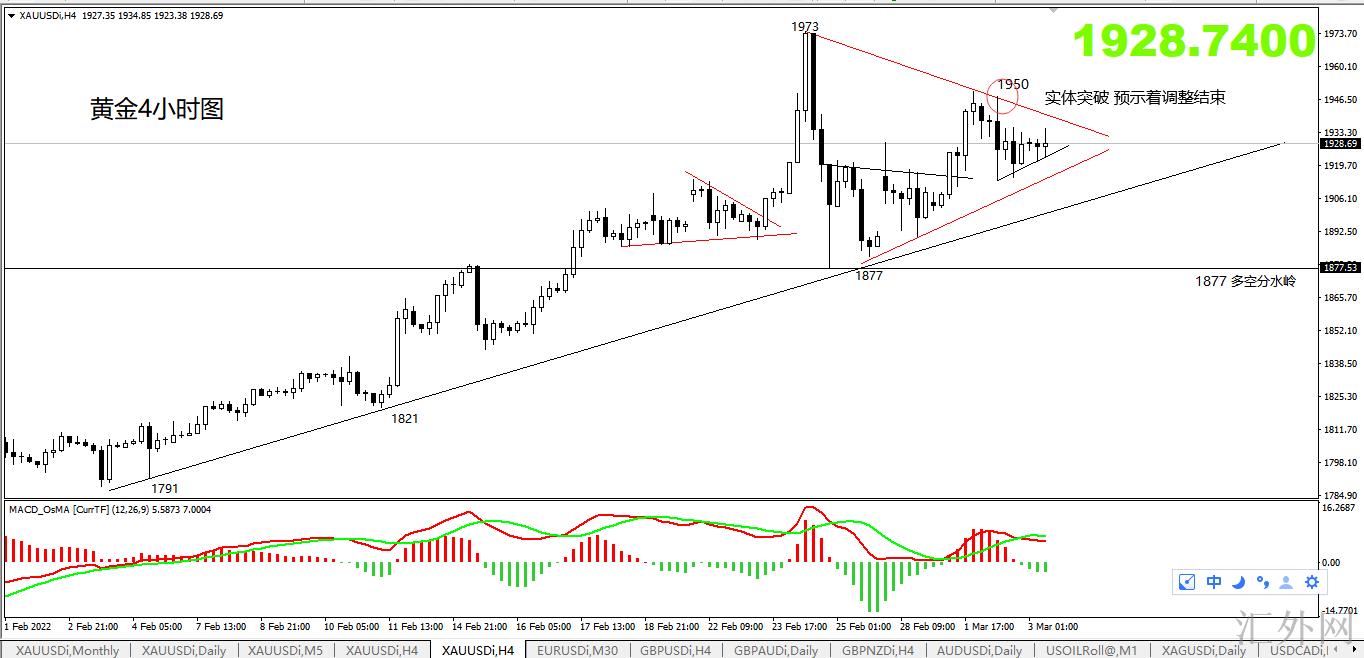 短线4小时层面,自刷新1973后面,黄金价格形成了高位下探,低位抬高的三角形整理形态,显现了大三角形套小三角形的现象,当前以及运行到大的三角形末端,夜里显现突破的机会在加大,至于突破方向,受于是整理形态,并没有形成顶部,所以更倾向向往上击穿位,三角形上缘压力在1938左右,下午直播是给到的1927多单短线可以在此位置退场,若想持续看到往上击穿位,则需求做好风控,一旦实体击穿次高位1950,便意味着黄金价格本轮在1970的调动已经终结,到时注意破高峰的机会,以下则着重注意1877一线水平支撑,直有朝下击穿此位置,4小时才可转为下跌趋势。