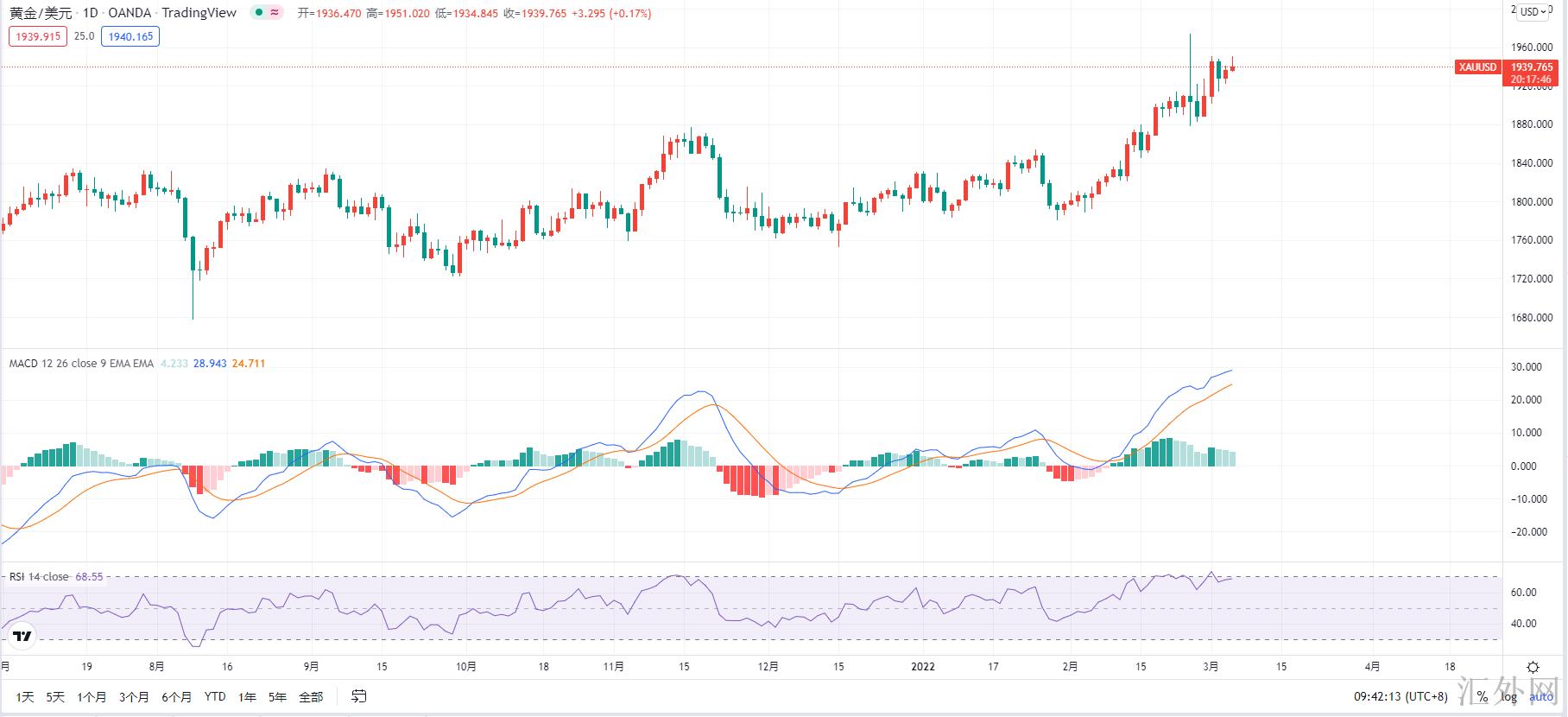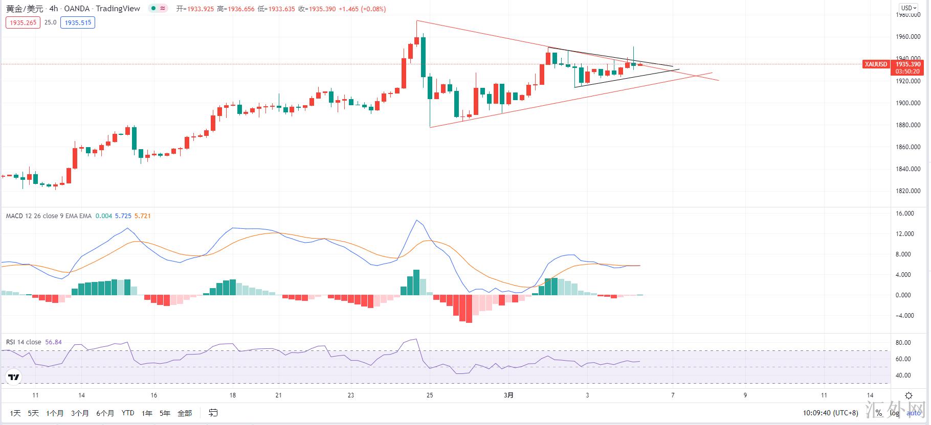 黄金持续震荡上涨筑顶,一直在看黄金筑顶,一直在等候黄金空单,但是就当下黄金各个周期的状况,空单仍需要再等一等,黄金星期四迈出了4小时级别的二次顶背离形态,所以昨天一整天黄金走的就是4小时级别二次顶背离成立,4小时快慢线死叉后面的修正行情。而二次顶背离成立后面行情没有直接下探而是高点震荡调动,这代表着什么就不用我说了吧,文章中都快说烂了,后市的突破方向大约率均为往上的,这也是为何昨天直播中一直推荐买涨的原因。那么当前4小时级别的MACD快慢线在0轴上方又一次金叉,黄金也击穿了震荡区间,而且已经试探了前高1950的抑制,日间仍有机会回踩试探趋势线或许,那就将是异常合适的进场买涨的信号了!