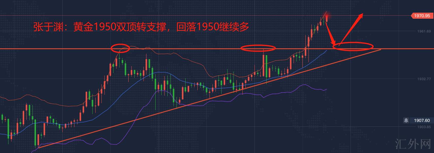 对于行情首先要确立慷慨向,大的方向确立了,首先布局方向不会出错,那么止损的时机肯定是行情显现反复,点位的选择不是很合理,那就会显现回撤止损,我们也有止损的时机,不是没有,但是我们确定的行情行情方向是对的,大的方向依旧未能更改。黄金周线又一次收一个长长大阳线,买方趋势已经不需求再分析了,同期黄金4小时线强劲上探,大阳线接连竖起,昨晚大非农,强劲击穿1960一线,均线被强劲带到上升,特别是50均线靠近垂直的角度上升,50均线差不多只能目送k线上升,收盘价也是位于压力位1950上方,顶部直接转为底部,直接多!