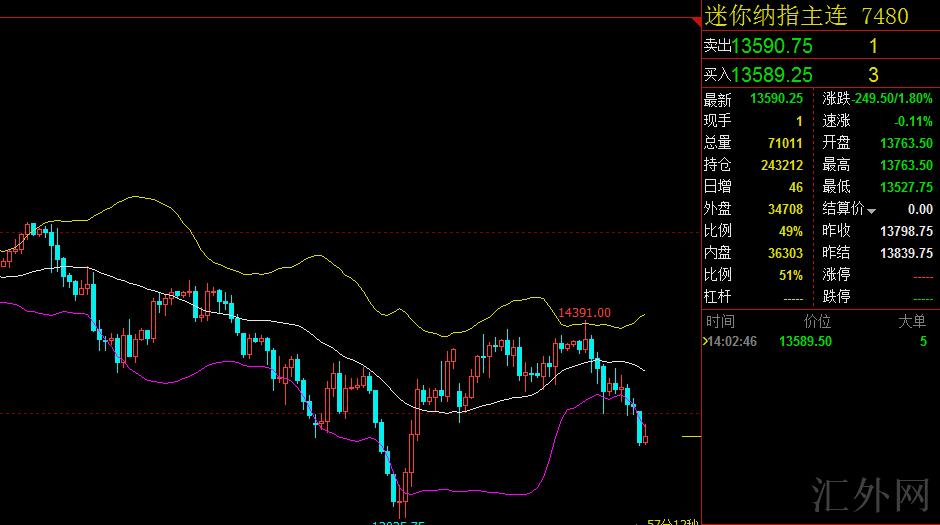 纳指周评给出高点空单,当前来说只适合等候回弹,当前小时线收线短周期仍有回弹需求,关注中轨抑制情形一线,激进可以短线在上方一线压力位置开空,13760-13780开空,有机会抵达13880-13920补空一次,计划看13480左右就可以。