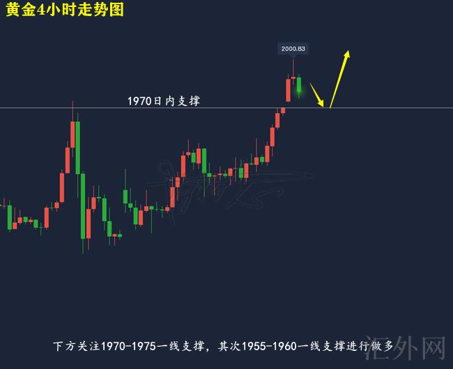 黄金技术分析来分析,日K线上,上星期五黄金依托MA10日移动均线上升,亚盘适当下跌MA5日移动均线后回涨,并在夜里刺破上缘,报得实体大阳,日K线上,即使黄金收阳,但仍未击穿前期高位仍有回调需求;4小时上,星期五黄金在亚盘经历短暂盘整后走震荡上涨行情,目前布林带马上开口,MA均线三线往上,KDJ随机指标三线并拢朝下,MACD指标红色量能柱适当缩量,快慢线金叉往上,综合来说,今日早间黄金跳空高开,刺破2000关口,创下日间高点2000.83美元一线,但随后展开回调,当前来说黄金当前仍有回调需求,恐会回补空缺后展开上升,日间交易参考回撤买涨为主,以下注意1970-1975一线支撑,若刺破则注意1955-1960一线支撑。