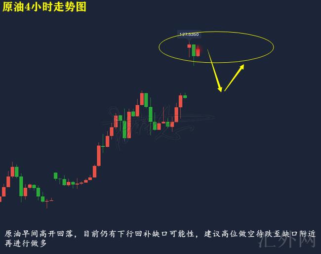 原油技术分析来分析,日K线上,上星期五原油依托MA5日移动均线展开上升,并击穿上缘,报得实体大阳,日K线上,原油又一次上升,但在没有击穿前期高位短时间仍有盘整机会;4小时上,上星期五原油在亚盘短线失守中轨位置后回涨,并走震荡上涨行情,同期在收盘刷新上缘位置后适当回调,目前布林带马上开口,MA均线迈出金叉,KDJ随机指标三线往上,到达超买,MACD指标红色量能柱连续放量,快慢线有金叉往上需求,综合来说,今日早间原油跳空高开,刺破130关键点位,创下日间高点130.5美元每桶,随后展开回调,日间原油持于高点盘整,也或许存在回补空缺机会,所以不提倡执行高点买涨,日间当前先依托126-127左右压力执行买跌看空缺回补左右买涨。