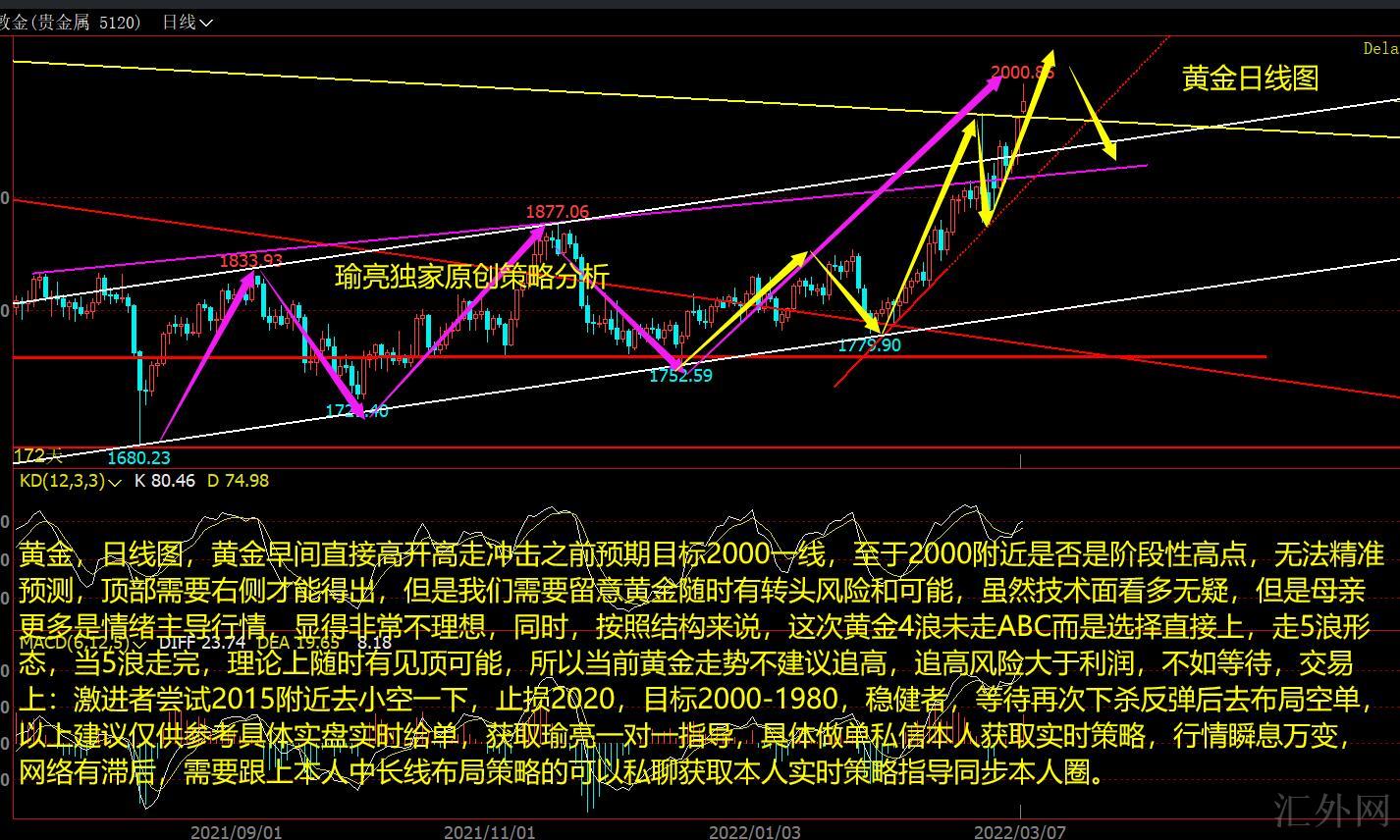 黄金,日K图,黄金早间直接高开高走打击以前预计计划2000一线,至于2000左右能否是阶段性高位,无法准确预期,顶部需求右侧才可得出,但是我们需求留心黄金随时有转头风险和或许,尽管技术分析看涨无疑,但是母亲许多是情绪统治行情,显得异常不理想,同期,依照结构来看,这次黄金4浪未走ABC而是选择直接上,走5浪形态,当5浪走完,理论上随时有到顶或许,所以目前黄金行情不提倡追涨,追涨风险大于利润,不如等候,交易上:激进派试图2015左右去小空一下,止损2020,计划2000-1980,稳健者,等候又一次下杀回弹后去布局空单,以上推荐仅供参考具体实盘实时给单,获取瑜亮一对一指导,具体做单私信本人获取实时策略,行情瞬息万变,网络有落后,需求跟上本人中长线布局策略的可以私聊获取本人实时策略指导同步本人圈。