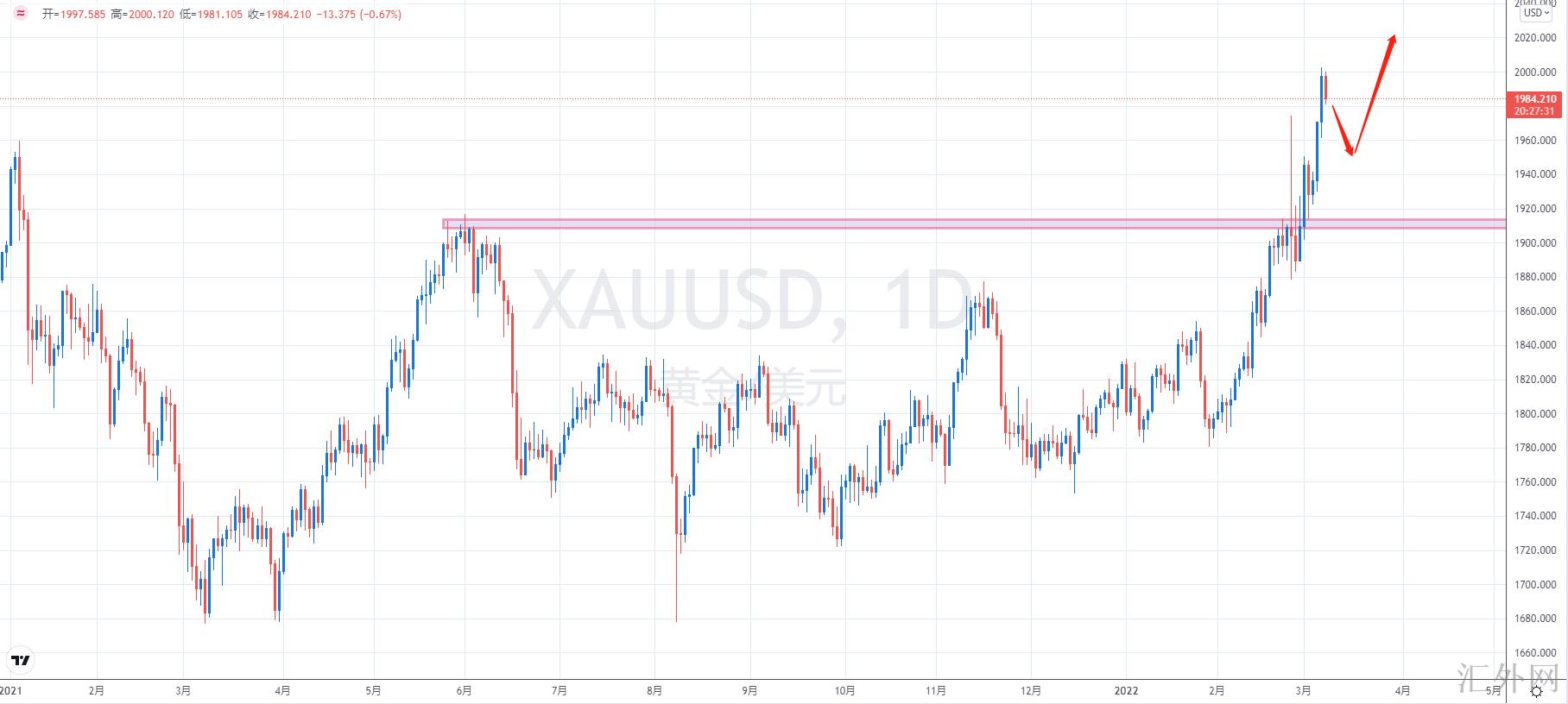 星期一黄金现货宽幅震荡,日间多次试探2000美元整数关口,连续刷新2020年8月迄今高峰,美盘前高点跳水,较日内新高回调逾40美元,随后又开放回弹,最终收盘上涨0.47%,报得1998.07美元每盎司