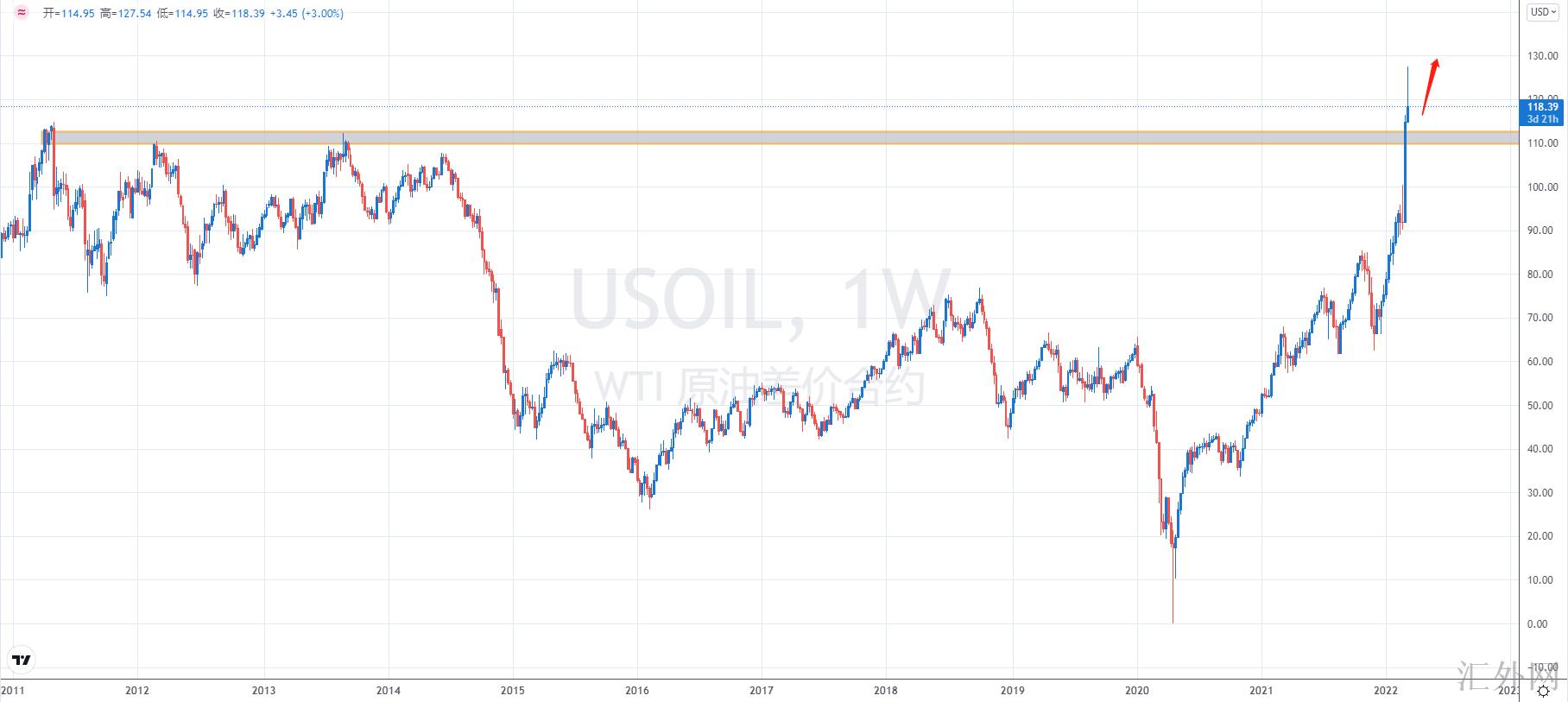 星期一(3月7号)美元指数高达2020年5月迄今的最高水平,因俄罗斯能源出口承受制裁的机会性助推大宗商品价格攀升,加重了经济停滞性通胀忧虑,致使美股走跌,美国国债收益率上升。俄乌矛盾令避险情绪连续高涨,助推黄金期货价格最多击穿每盎司2000美元关键点位。在欧洲和美国盟国斟酌禁止进口俄罗斯原油后,WIT原油刷新14年高位,收盘涨差不多4%,收盘在120美元每桶之上。伦镍盘中最多狂飙88%创前期高位到55000美元/吨,忧虑俄罗斯提供受扰助推买入狂潮。