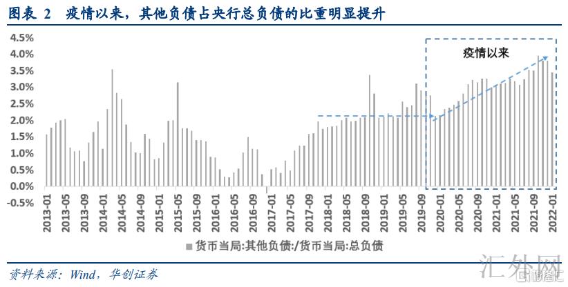 我们推断目前的未分配利润或体当下中央银行资产负债表的“其余负债”方面。顾虑到储备货币,不计入储备货币的金融性公司存款,发行债券,境外负债等四项科目均有清晰定义,而自有资金的体量太小(仅200亿附近,不足够支持万亿利润的上缴)。特别值得观察的是,其余负债科目在2013年到2019年阶段占中央银行资产的比重约为1.6%,流行病以来新高提及4.0%,较流行病前显著提升。