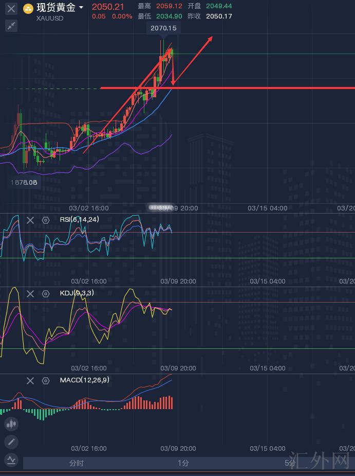 黄金昨日因米国对俄罗斯制裁升级,强劲打击前期新高,升幅接差不多90美金,午夜闪崩回撤了一次,首要是也快到历史2075高位,此外超买较为严重,在日K线持续收阳期间,回撤依然定义为一个回踩修正,回踩修正到位后面持续回到上涨趋势!当前关注黄金的大顶2075左右,2075是黄金有史以来新高点,一旦击穿将令打开大的区域,今天的黄金思路我们依旧看多,我们将依托2000支撑寻求买涨的可能。