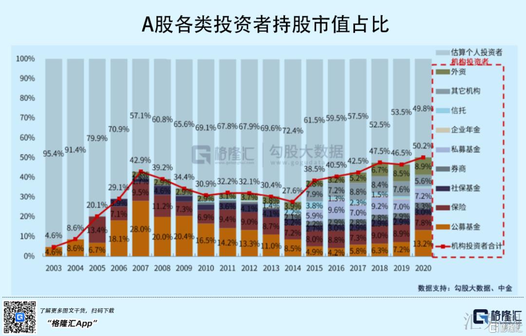 从机构定价来推演。2020年,机构投资人合计持有市值占比胜过50%,包含公募基金、私募基金、外资、保险等等。
