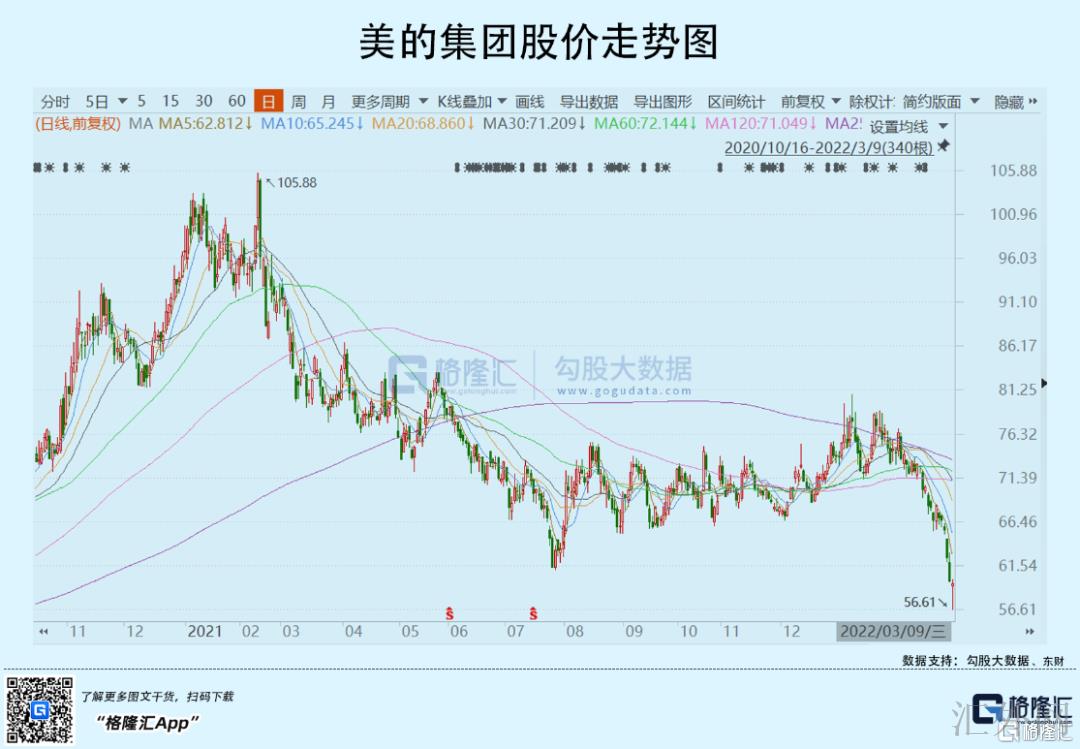 今年1-2月,保利签约销售额522.8亿元,同比下跌30.4%。万科同期销售额649亿元,同比下跌44.3%。简单粗暴对比,保利业绩比万科表现要更为出色。此外,一个攀高峰,一个创新低,市场看重的是后面股东资源的力量,一个是实力强势的纯正央企,一个是勉强算得上国企(深圳地铁)。房地产不行,家电慷慨向也不行,看看美的集团,最差不多1个多月降幅超25%,再创阶段新低。