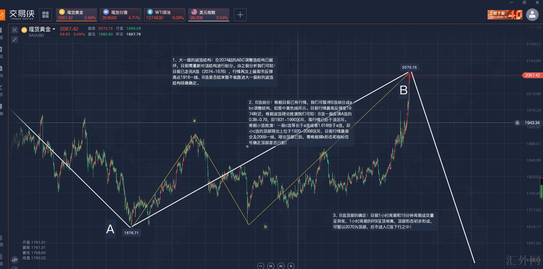 2、B浪细分:依据当前已有行情,我们可暂将B浪细分成abc调动结构,如图中黄色线所示。当前行情最高回弹到1974左右,依据波浪理论推演我们可知:B浪一般回弹A浪的0.38-0.79,即1831-1990区间,现行情已处在该区间。依据小浪推演:一般c浪等长于a浪或者1.618倍于a浪,即小c浪的顶部理论上位于1920-2068区间,当前行情最高企及2070一线,理论顶部已到,需依据裸k形态和指标信号确定顶部能否已到!