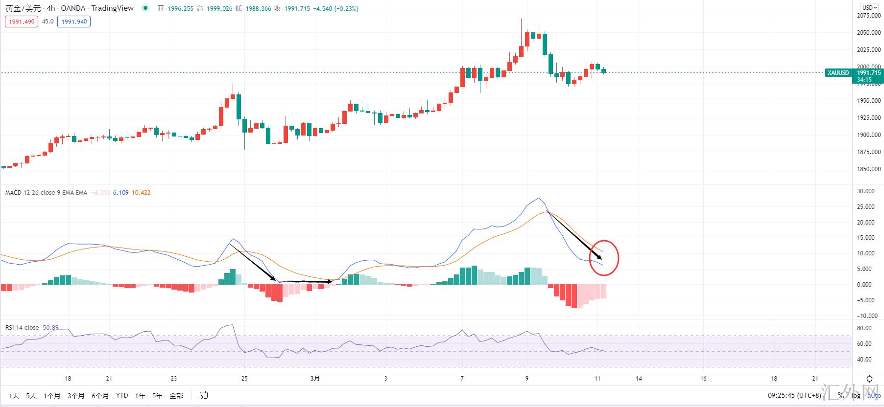 第二种情形是,黄金一直保持在高点震荡运行,小时级别的MACD快慢线迟缓的上涨上穿了0轴,那么黄金就很难再迈出回踩了,就需求着重关注上涨趋势线1988-1990一线的支持了,若能回踩趋势线不破迈出上涨,那么黄金这次4小时调动的底部就不是底背离形态了。