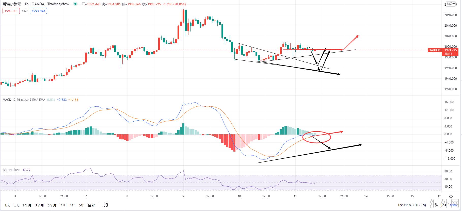 黄金小时级别,可以目睹行情相当复杂,会显现两种情形,隔夜黄金在冲顶试探到2005抑制后面高点盘整运行,小时级别的MACD快慢线已经运行到0轴左右,而且在0轴以下萎缩黏合,那么该种时候黄金就面对两种选择,第一种,小时级别的快慢线直接在0轴以下死叉,动员黄金下探,那么以下的上涨趋势线支撑1985,以及楔形上缘1963就会形成以下的核心支撑,假使黄金可以成功回踩楔形上缘,就迈出了新低,小时级别就迈出了底背离形态,那就极有机会完成底部的构筑,可以进场布局多单。