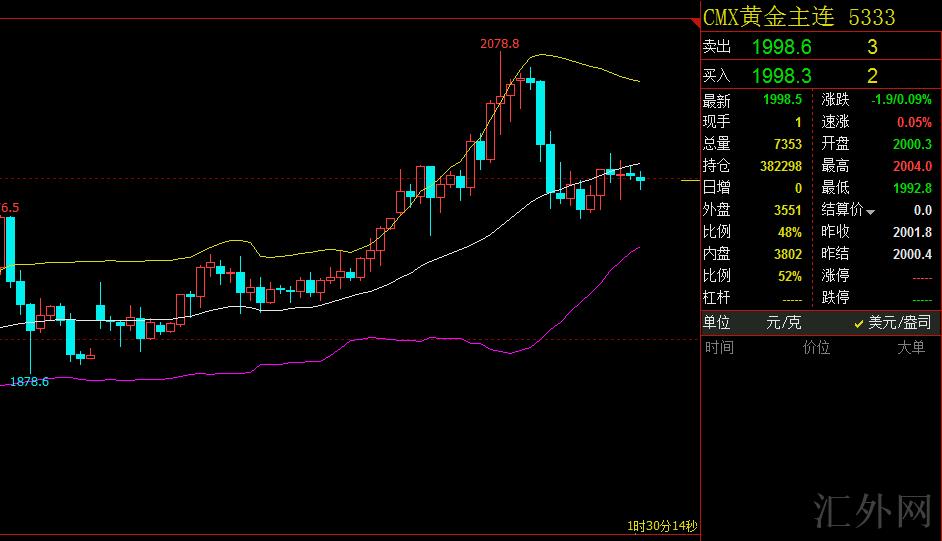 黄金昨日给出2010空单,最高回弹2015的位置,进场后面最低回调到1986的位置,今日来说黄金预期是一个续跌的行情,昨日内新高位有进场的朋友可以持续持有空单不变,看以下1980可以退场,多单依旧等候回调低点支撑再依据实盘进场。