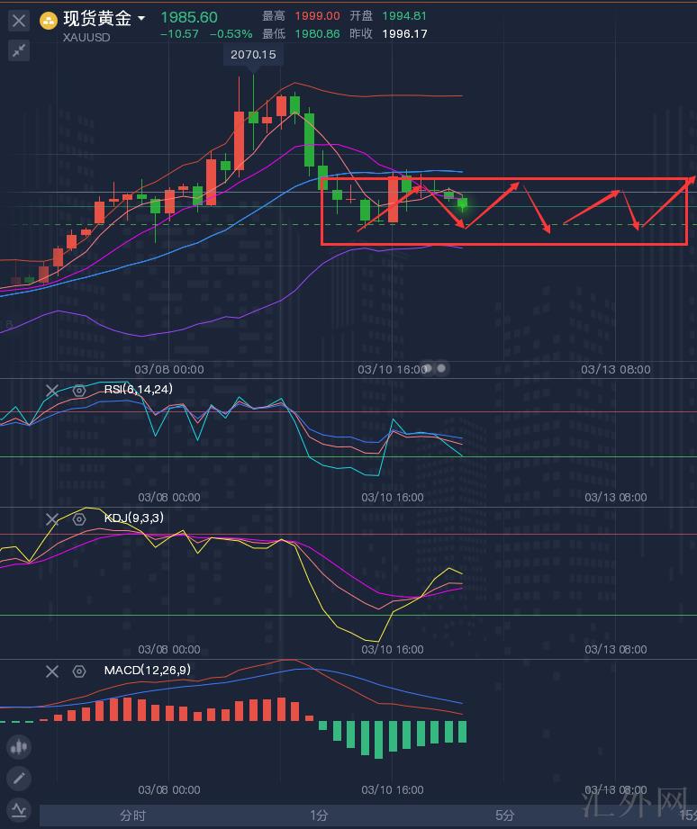 星期五(3月11号)亚盘时间,黄金现货震荡微跌,在此之前乌克兰与俄罗斯外长的会谈未能就停战困难获得进度,逢低做多盘持续给黄金价格供应支撑,而且美国2月通货膨胀率创40年高峰,吸引投资人购入黄金对冲通货膨胀。然而,下周将面临美联储利率会议,市场广泛预计将加息25个基点,而且将来将连续加息,这令买方仍有所顾忌。