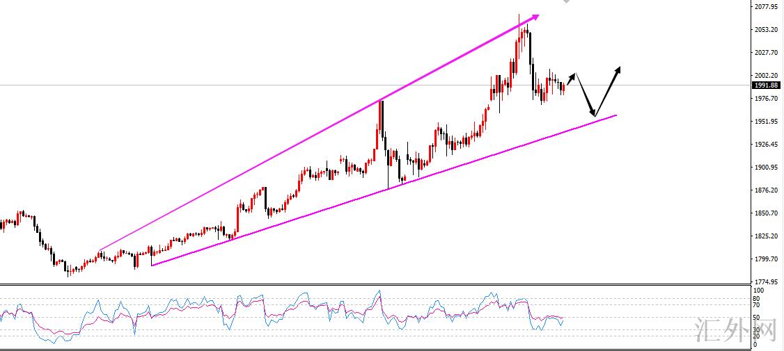 当前需求我们关注的是,现在黄金价格距离趋势线仍有几十美金的区域,将来的行情是先直接回踩再开始涨,依旧以盘整代替下挫,用时间换空间?