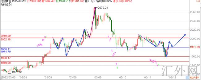黄金当前到1960这里开始回弹,当前最高已经是刷新到1980上方。