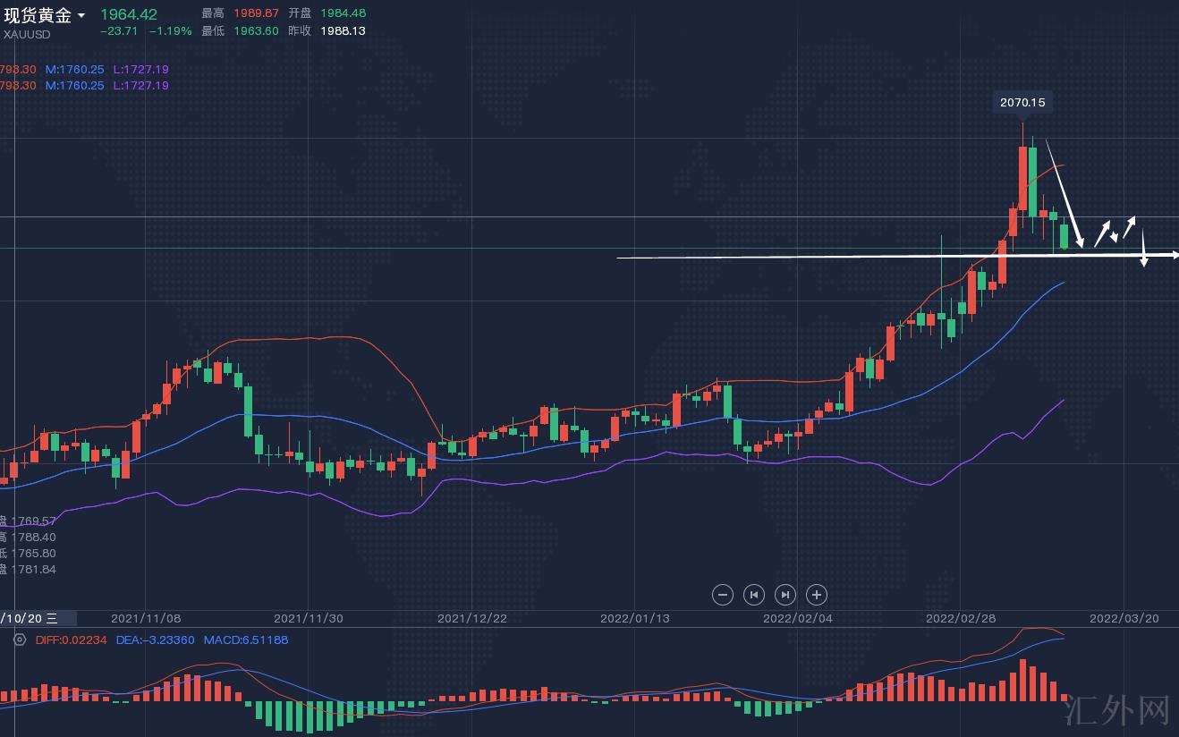 ①、黄金避险逐渐减退后将于迎重量级报告,可谓是一刻也不停歇,本星期三的恐怖零售报告以及美联储利率会议将引领新一次趋势。首先就俄乌情形来说今日会举办第四轮协商,结果即使不会即将转好,但市场恐惧情绪也不会增强,所以笔者个人觉得周初会以回到技术分析为主选择震荡运行后等候星期三再次暴发趋势,可环绕1950-1995区间开仓。