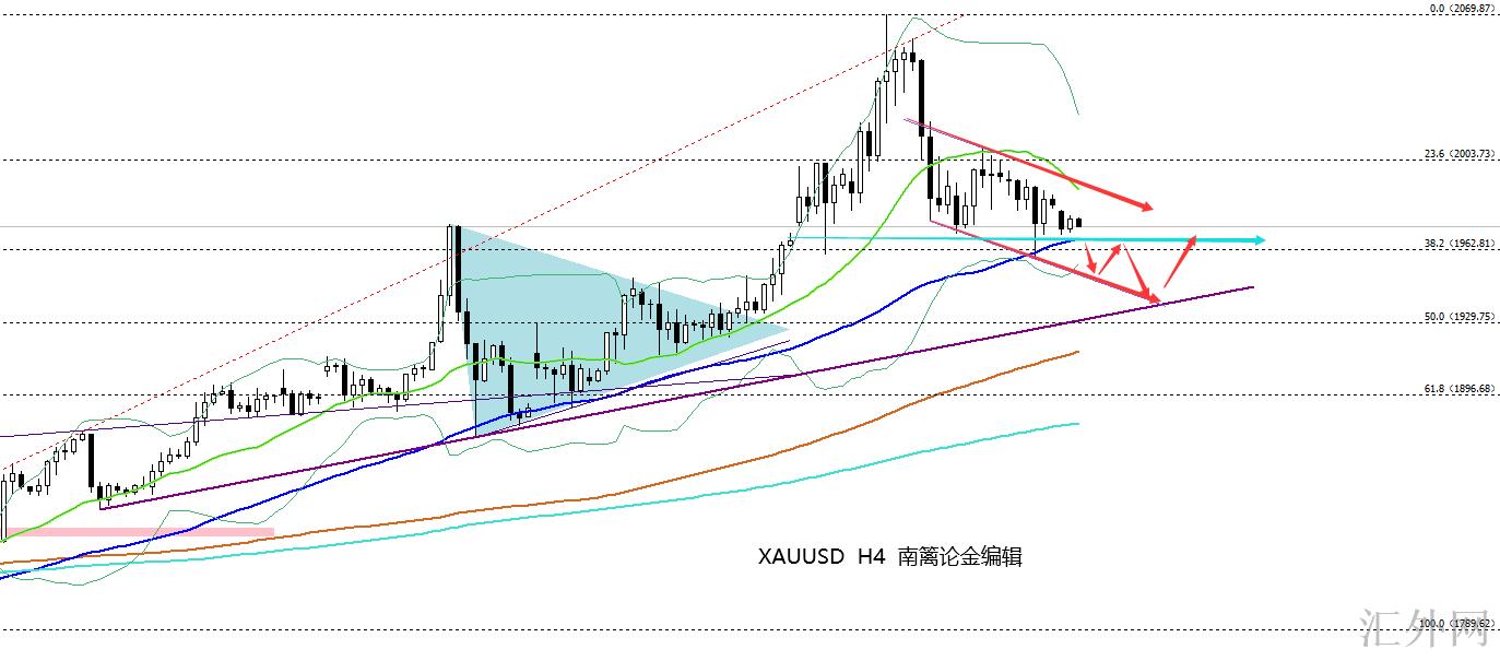 诚然说回日间,黄金在1970一带已经横盘了将差不多9小时,1970曾是我们数次下手测多的位置,亦是短线的多空分界线,但今天的关注点是得走一部分偏移的,对黄金来看周初即使保持弱势横盘,但结合上周4H处黄金的横盘,不难得到这里的支持越来越弱的结论。所以,这里只适合超短线的投资人进场捞鱼,上方抑制中轨1980—88。日间遇阻顺遂的话,下看计划需求转移到1960/50一带。