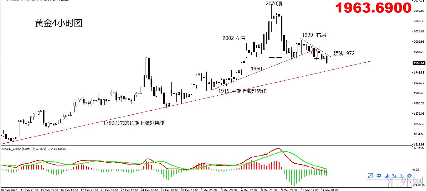 4小时头肩顶颈线有待突破,突破后注意长期上升趋势线1950一线支撑情形。