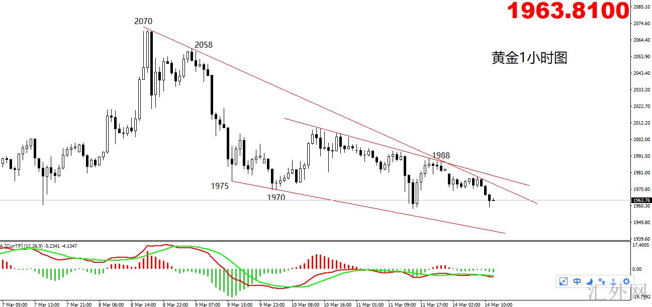 短线1小时运行在下滑楔形中,夜里环绕下滑楔形上缘1972买跌以及下缘1945买涨。