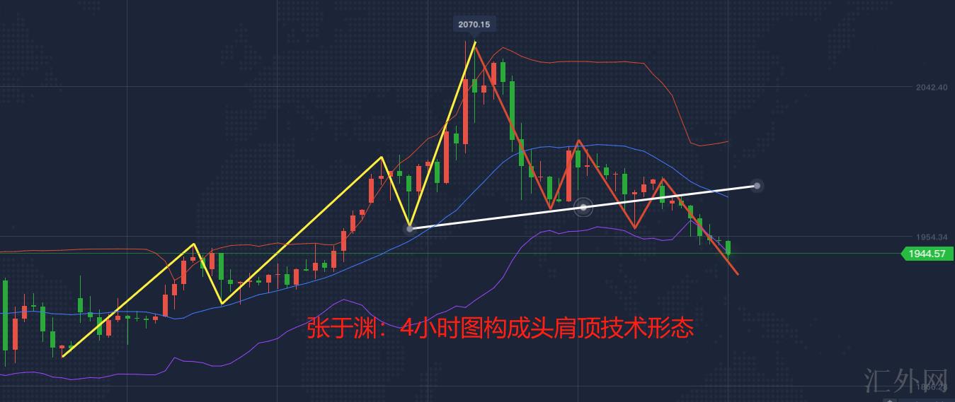 从技术行情上来说,4小时图环球黄金价格已经把“头肩顶”技术形态构筑完成,依照头有多长,降幅有多长去计算空间的话,跌穿颈线位后降幅不会小。单从这个角度算,黄金价格应当去一次1880美元一线。从月线上来说,黄金价格3月份推涨到2070美元后展开的下挫,显示了完成了与2020年8月2075美元的一个轴对称结构。所以后市也是看跌。