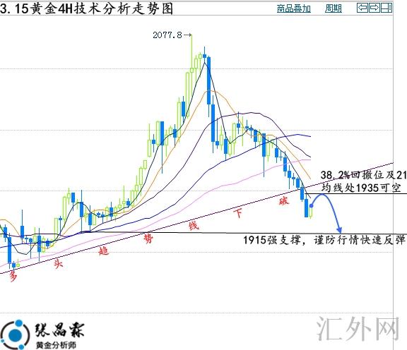 黄金价格星期一跌穿始于2月初的上涨支撑线,星期二保持下跌趋势,并跌到21日移动均线和2021年9月-2022年3月升势的38.2%斐波那契回撤位,上述水平在1935左右。从日K图来说,上个月初以来最看跌的MACD信号,以及朝下倾斜的总体强弱指数(RSI),也为看空倾向供应支撑。早盘黄金价格跌穿核心水平1935,后市恐更深一步暴跌。若失守1900,那么1877左右的2021年11月高位,或许会在后面对卖方组成考验。至于4小时线,MACD金叉开口连续扩大,均线朝下击穿平衡线,绿色量能柱放量,卖方趋势增强,同期布林带开口打开,且朝下拐头,价格处在下缘平滑运行,行情回踩需求不大。那么在美联储加息靴子落地以前,张晶霖推荐持续顺势回弹买跌黄金即可。