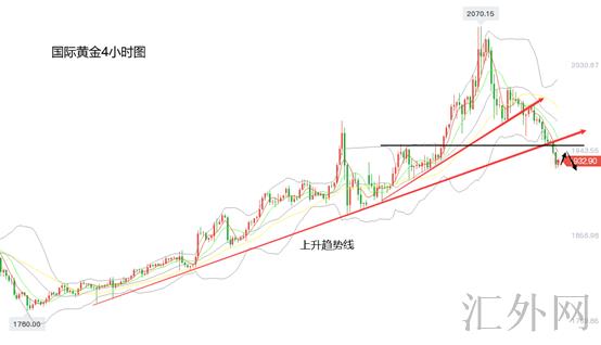 日间黄金价格遇阻,跌穿上涨趋势线,并接连失守1950美元和1938美元2个核心支撑,前者是前期黄金价格波峰高位位置,以及上涨趋势线位置,后者是日K线布林带中轨位置,当前支撑线转变为压力线,后市维持关注。