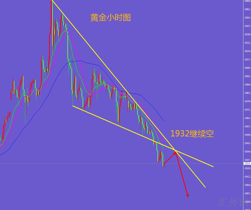 从小时图来说,黄金处在15均线以下,毫无回弹之力,弱势朝下,瀑布的行情,以下计划看1900,跌穿将持续瀑布,黄金没有底,带好防守,顺势买跌即可,美盘可以在1932持续埋伏空单,触碰就是干空的可能!