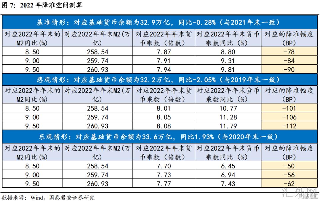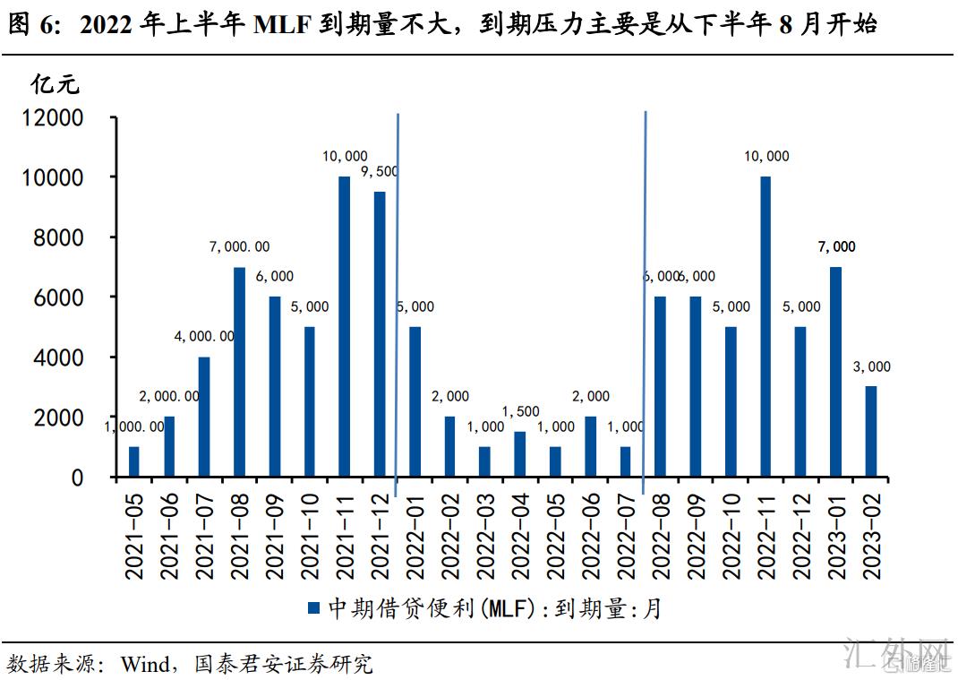 降准层面,本轮降息落空的同期,MLF超标续作2000亿元,余额高达4.95万亿,2021年7月和12月降准时余额分别为5.4万亿、5.1万亿,自此2022年上半年MLF余额阻力尚不大。另外,再加上中央银行等特定机构上缴结存利润,财政开支加大,以及2022年上半年MLF到期量不大,流动性阻力也首要是从下半年8月开始突出。2022年8月MLF到期量从1000~2000亿元的状态直接调升到6000亿元。所以,我们觉得,短时间内(3-4月)降准几率有所下滑。而从全年来说,2022年末广义货币供给M2保持2021年底9.0%的年度增速,货币乘数则需求扩张到7.91倍,对应法定存款准备金率仍需要调降1个百分点附近。从2021年降准先放出,后续连月缩量续作MLF的经验来说,降准更或许发生在二三季度。