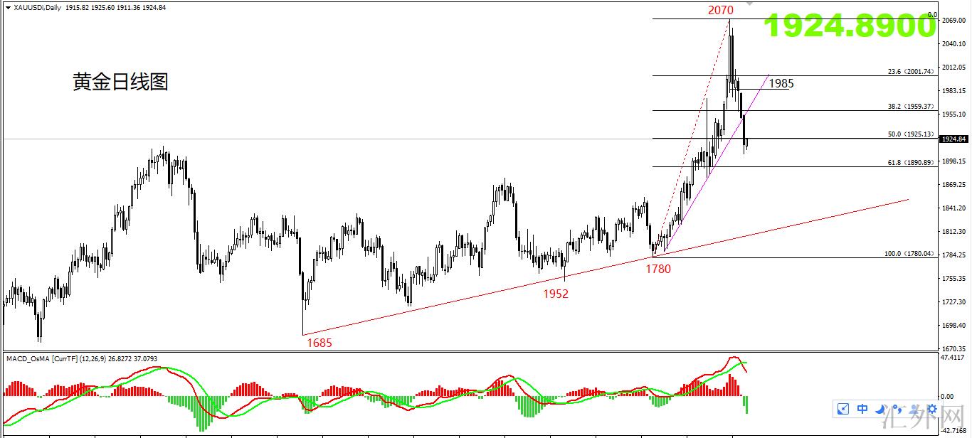 尽管MACD指标快慢线已经死叉运行,卖方量能亦在逐渐放量,但是死叉位置较高,而且快慢线还运行在零轴上方,所以此段回调当前导致日K线的调动,想要暴跌,日K线需求形成顶部形态才行,或者是跌穿1685以来的上涨趋势线,如此黄金价格才会进入熊市,但是,行情在2070下挫日K线不走次高位的情形下,很难单顶跌穿此趋势线,所以对于月底黄金价格的行情,大家需求注意日K线能否会环绕1900形成新的区域震荡,酝酿上升,依旧回弹走次高位,形成顶部下探,不管是哪一种,日K线短时间内很难再去考验2070前高。