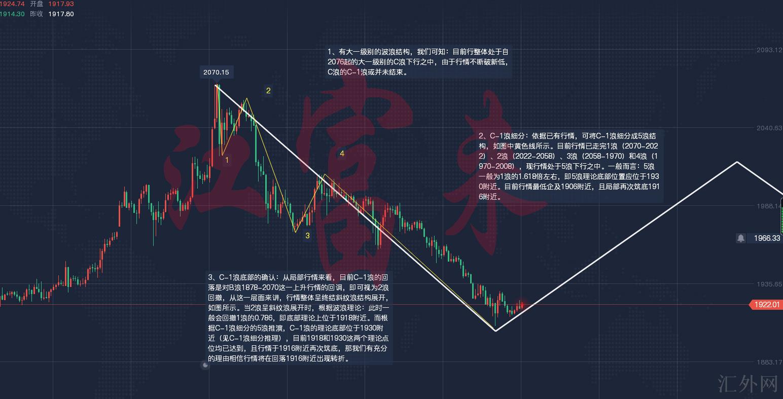 3、C-1浪细分:根据已有行情,可将C-1浪细分成5浪结构,如图中黄色线所示。当前行情已走完1浪(2070-2022)、2浪(2022-2058)、3浪(2058-1970)和4浪(1970-2008),现行情处在5浪下探当中。一般来说:5浪一般为1浪的1.618倍附近,即5浪理论底部位置应位于1930左右。当前行情最低企及1906左右,且局部又一次筑底1916左右。