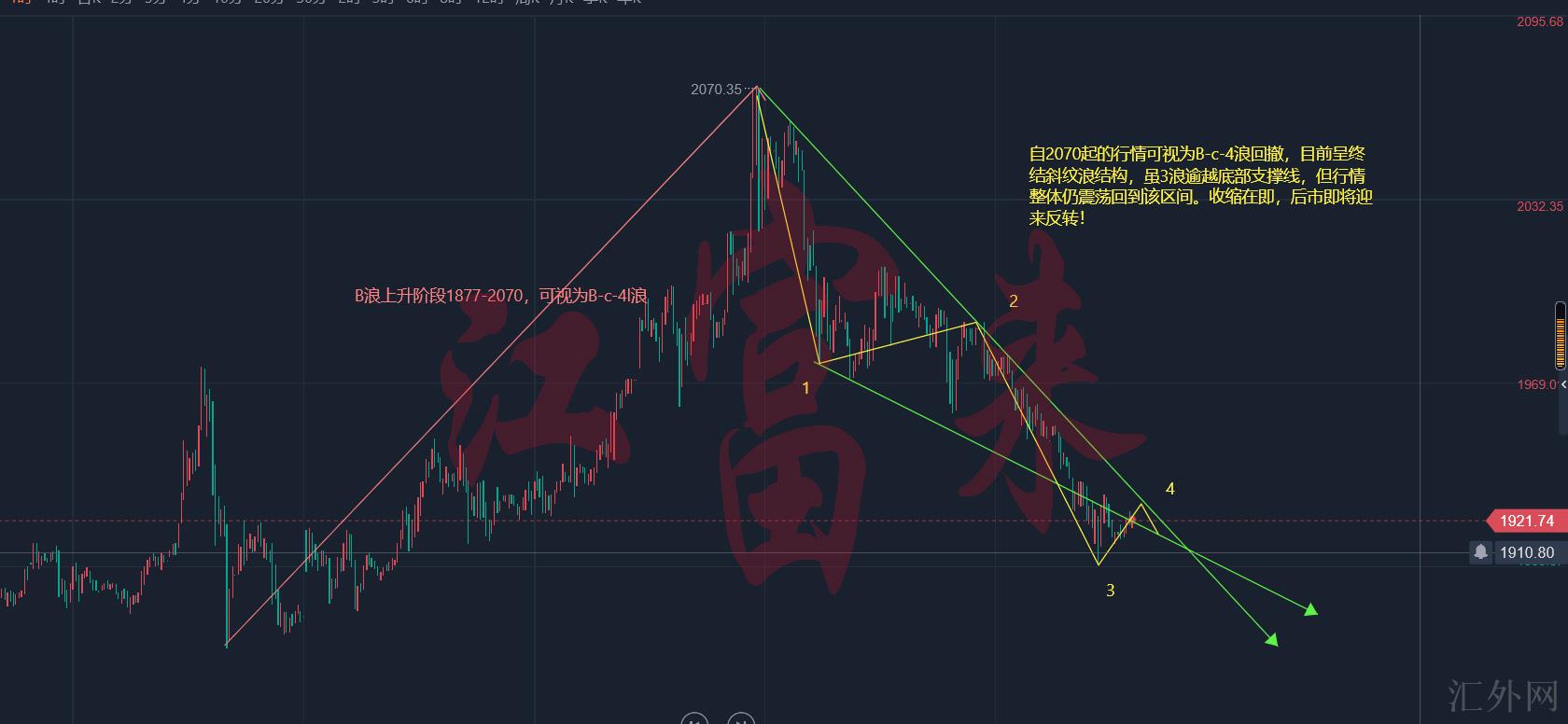4、C-1浪底部的证实:从局部行情来说,当前C-1浪的回调是对B浪1878-2070这一上涨行情的回踩,即可看为2浪回撤,从这一方面来讲,行情整体呈结束斜纹浪结构展开,如图所示。当2浪呈斜纹浪展开时,依据波浪理论:此时一般会回撤1浪的0.786,即底部理论上位于1918左右。而依据C-1浪细分的5浪推演,C-1浪的理论底部位于1930左右(见C-1浪细分推理),当前1918和1930这两个理论点位均已高达,且行情于1916左右又一次筑底,那我们有充分的理由相信行情将于1916左右显现转折。
