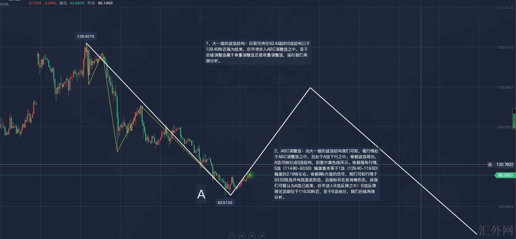 2、ABC调动浪:由大一级的波浪结构我们可知,现行情处在ABC调动浪当中,且处在A浪下探当中。依据波浪理论,A浪可细分成5浪结构,如图中黄色线所示。根据现有行情,5浪(114.80-93.50)程度差不多等于1浪(129.40-119.60)程度的2.18倍附近。根据裸k层面的信号,我们可知行情于93.50筑底并构筑圆底形态,且指标存在底背离形态,故我们可暂觉得A浪已终结,后市进入B浪回弹当中!B浪回弹理论顶部位于116.00左右,至于B浪细分,我们后续再做分析。