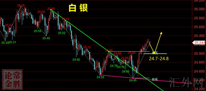 白银趋势分析:昨日银价先跌后涨,日k线收一根下影与上一个交易日等长的阳纺锤体,表明了以下做多盘较为强势。受于股市的大幅上升,提升了白银市场。短时间来说,银价临时止跌回弹。有希望再次向25.50区间挑战上方阻力效果。但是因为于白银的行情较为奇特。有时密集的支持,差于有关市场痛跌导致的影响。所以,我们不必急于看多白银。起码总的趋势依然处在卖方统治之下。短时间回弹,随时或许承受来自黄金交易市场下挫的牵累。所以我们临时保持白银在24.50-25.50区间震荡运行的分析。既然而于看多白银,也不忽视短时间超跌后的做多盘力量。等候新的基本分析和有关市场方向性指示。