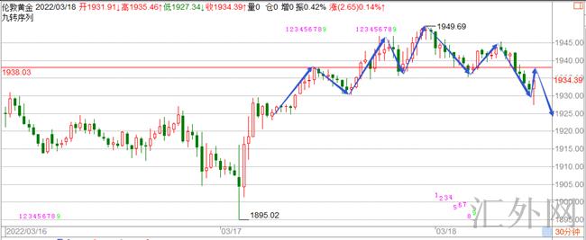 黄金在昨日上升到1949左右形成了一个头肩顶,当前1930可以说是底部位置。