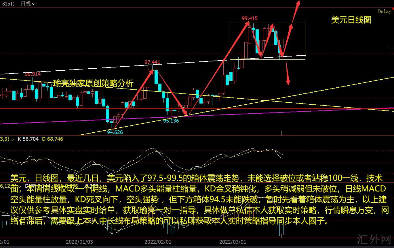 美元,日K图,近期几日,美元深陷了97.5-99.5的箱体震荡行情,未能选择突破或者立住100一线,技术分析,这周周线收取一个阴线,MACD买方能量柱缩量,KD金叉稍钝化,买方稍降低但未突破,日K线MACD卖方能量柱放量,KD死叉朝下,卖方强劲 ,但以下箱体94.5未能跌穿,临时先看着箱体震荡为主,以上推荐仅供参考具体实盘实时给单,获取瑜亮一对一指导,具体做单私信本人获取实时策略,行情瞬息万变,网络有落后,需求跟上本人中长线布局策略的可以私聊获取本人实时策略指导同步本人圈子。
