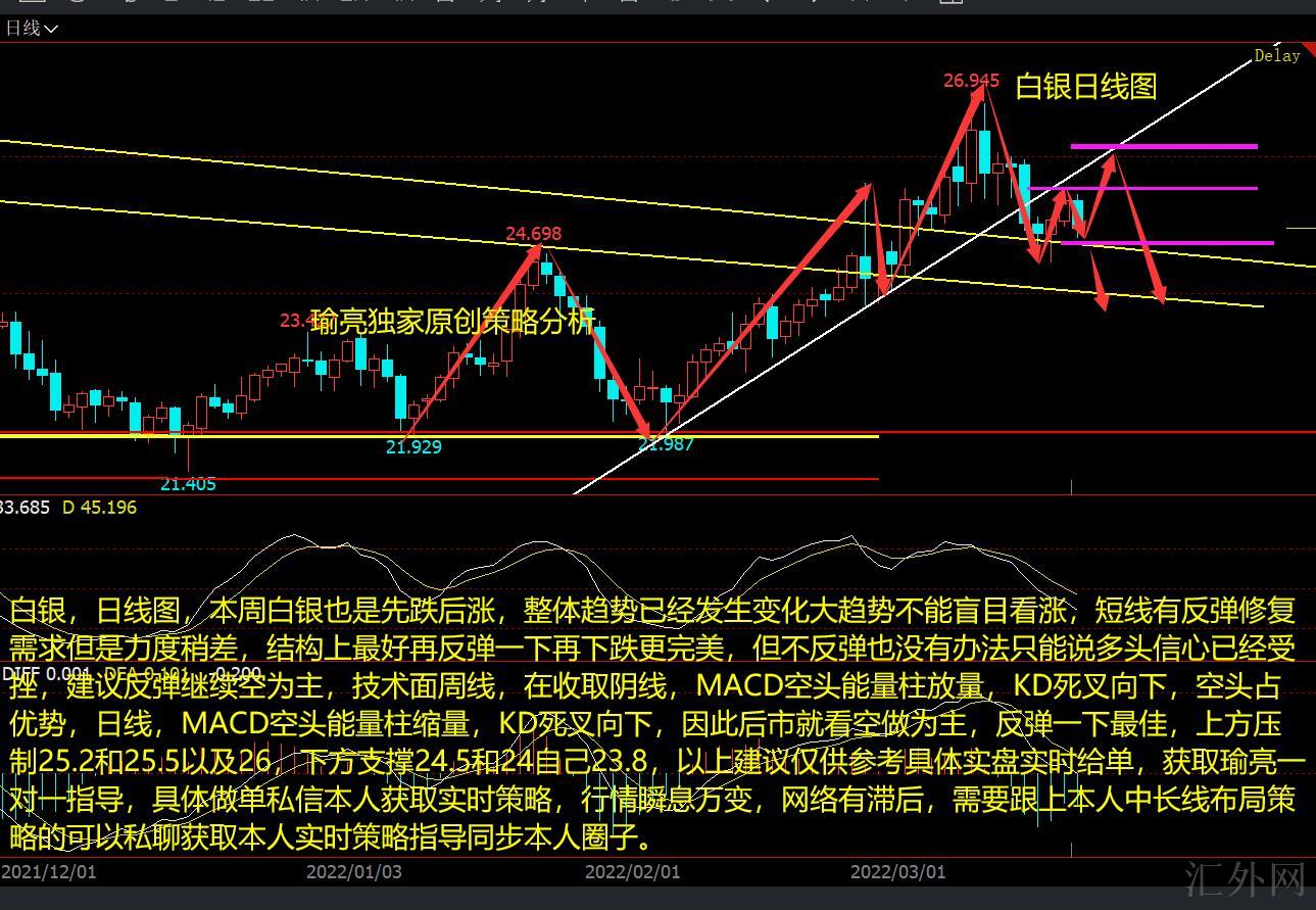 白银,日K图,这周白银也是先跌后涨,整体趋势已经发生改变大趋势不能盲目看多,短线有回弹修复需求但是强度稍差,结构上最佳再回弹一下再下挫更完美,但不回弹也没有办法只能说买方信心已经受挫,推荐回弹持续空为主,技术分析周线,在收取阴线,MACD卖方能量柱放量,KD死叉朝下,卖方占优势,日K线,MACD卖方能量柱缩量,KD死叉朝下,所以后市就看跌做为主,回弹一下最好,上方抑制25.2和25.5以及26,以下支撑24.5和24自己23.8,以上推荐仅供参考具体实盘实时给单,获取瑜亮一对一指导,具体做单私信本人获取实时策略,行情瞬息万变,网络有落后,需求跟上本人中长线布局策略的可以私聊获取本人实时策略指导同步本人圈子。