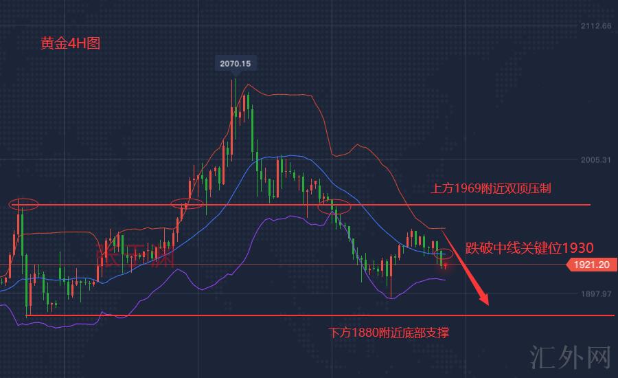 黄金从技术分析来说,日K线级别来说,倒“V”反转;MACD死叉,KDJ死叉,卖方任然占领上风,关注布林线中轨1928.05左右支撑,若跌穿该支撑,则需求注意更深一步下挫风险,更深一步支撑参考1920关键点位,随后是3月15号低位1907左右支撑,1900关键点位也是心理支撑点所在;强支撑在61.8%回撤位1890.98左右。然而,布林线中轨当前仍给黄金价格供应支撑,KDJ有拐头态势,买方短线也仍有机会,初始压力在21日移动均线1941.78关键点位左右,注意1950关键点位左右压力,假使收回该位置,则有希望更深一步试探10日移动均线1969.34左右压力。2小时级别震荡;布林线收口,留心布林线轨道1909.43-1953.49区域击穿情形。MACD和KDJ死叉,当前正试探布林线中轨1931.49左右支撑,假使跌穿该支撑,则或许更深一步跌到布林线下个1909.43左右。若黄金价格守在布林线中轨支撑,则黄金价格仍有机会涨向布林线上缘1953.49左右。