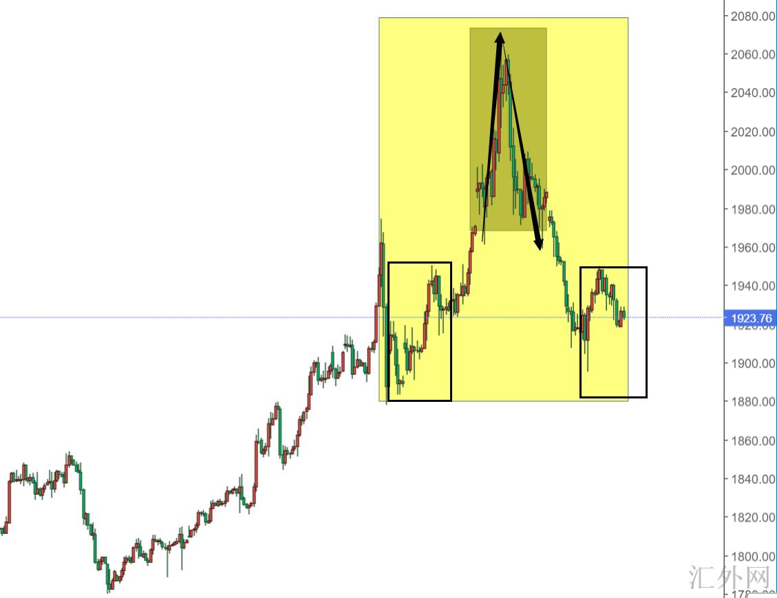 所以说,右边这段震荡我觉得会保持比较久的时间,由于它不比前期是在外界避险刺激的条件下直线上涨的,低位1895,高位1946,能在这50美金内再多一部分K线轨迹,好歹能让我们对下一次趋势执行布局,所以在这以前,你没必要去看破,只需拿到1908,做一次70美金的利润就行。