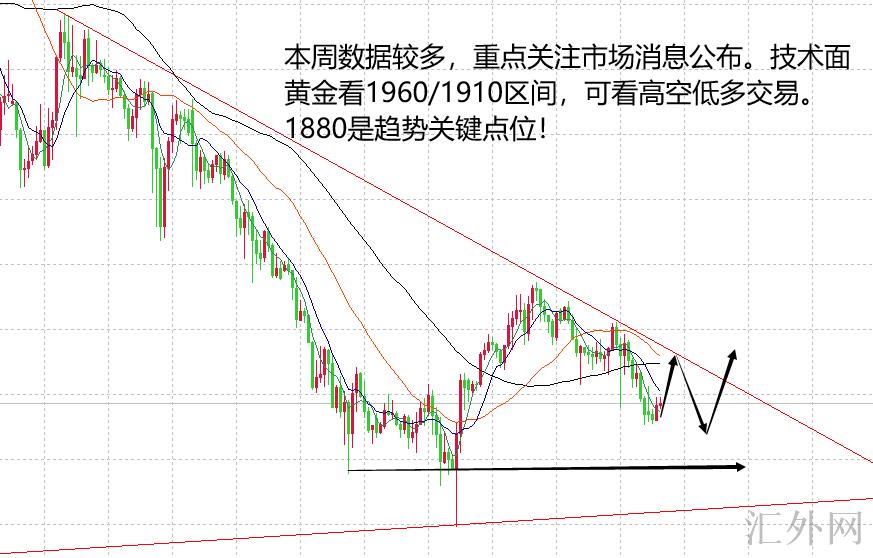 回到到这周对黄金交易市场的注解,这周黄金在数据作用之下会迈出短时间的不规则震荡,但整体依旧在技术分析内表现,临时所看的的行情大约率是震荡表现,难迈出过分的大涨痛跌行情,上周下挫后上升,星期三,星期四显现日K线连阳,但星期五的下挫损坏了黄金的三连阳上升趋势,所以,对于临时的行情来说,黄金大约率是震荡表现,可看的显著区间在1950/1910,此区间在也是H4周期当前收口的状况规模,不破此区间走不出临时的规模,所以,周内临时可在此区间做高空低多交易。诚然,假使在市场环境的影响下迈出突破强度,上升突破1950,高点可见1972,低点突破1910,可见1880,其中1880是这个周期卖方行情的强弱分界点,暴跌行情看1880的得失。对于日间行情来说,星期一早上正常开盘在1922左右,小周期收口可直接买涨,先看欧元兑美元盘到1940,迈出震荡表现,不会迈出较大行情,1940抑制可看震荡回调空间,全天做短线,积攒利润。