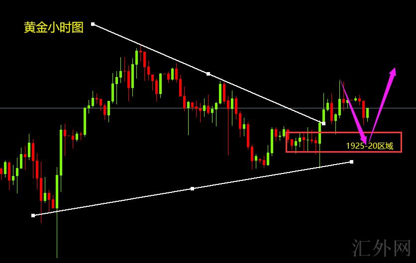 昨天的收敛形态突破后方向没有迈出来,今日结构向上瞧,有走二次收敛之势,理论上讲,震荡的时间越长,那么突破的强度越大,也就是决确定一次的方向,这个时候,我们在收敛形态内,尽量只做首次,比如首次给低买涨,首次冲顶买跌,图中这个夹角区域,与我上面分析的点位也是统一的,所以今日短线可以参考这个区域操作;若非要为突破方向定义,我个人更看好于向往上击穿位,第一大结构当前走的是1894的回弹,我个人觉得这段修正仍未终结,仍有空间,首次1894回弹到1950,60美金空间,当前走第二轮1917的双底支撑回弹,空间若走50-60美金,上方可目睹1965-1970区域,这也是我昨日分析的,这周着重关注的1965区域,到时给到这个区域,中线空单是推荐参与的;这是结合K线个人技术看法,诚然若是朝下1917突破,我觉得是值得直接追空的;长时间的震荡往往夹杂着洗盘的味道,黄金若一直遭遇阻力似跌,那么大约率上升,黄金若迅速下挫,不能盲目做底,这是最近需求留心的行情,往往这个容易出砸盘报告。短线操作上推荐:需求获取每日在线实时指导操作策略及解一套策略,可主页直接添加本人一对一指导交流本人将尽量为您排忧解难。