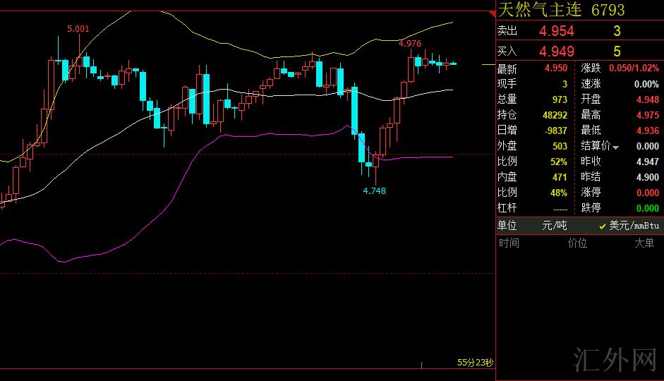 分析:天然气连续了一个月的高抛低吸,一直在5.000-4.400的区域震荡,昨日给出4.770的多单,最低跌向4.748的位置进场,最高靠近一线止盈计划,当前四小时又一次横盘走跌,日K线大趋势买方不变,看多为主。