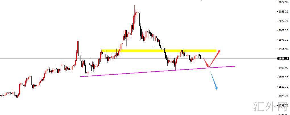 现在既然没有突破,今天日间交易上可以注意1921止跌的接多机会,10美金在内防守即可,向上瞧星期五高位1940区域。此外布林带指标通道下缘也是指向这个位置,需求留心今天美盘假使破新低,就不宜再过分看涨了,等候4小时止跌再说,关注以下支撑1906--1890