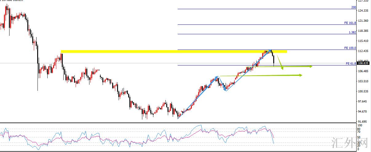 至于以下的区域,星期五跌了3.6美金,今天起码是这个量级的水准,甚至翻一倍也是或许的。以下着重留心昨天美盘的区域支撑106以及星期五高位104左右的止跌情形,想要顺势接多的可以等显现反转K线信号后进场。