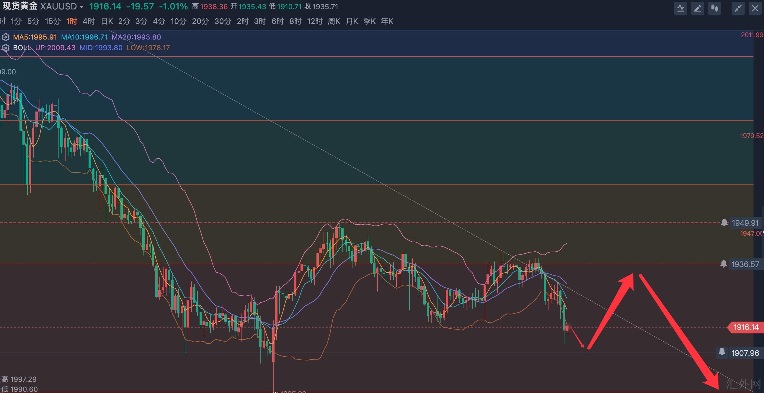 黄金短线操作策略:今日见1927左右买跌,计划看1900左右,损1935。